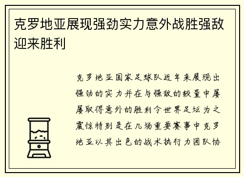 克罗地亚展现强劲实力意外战胜强敌迎来胜利